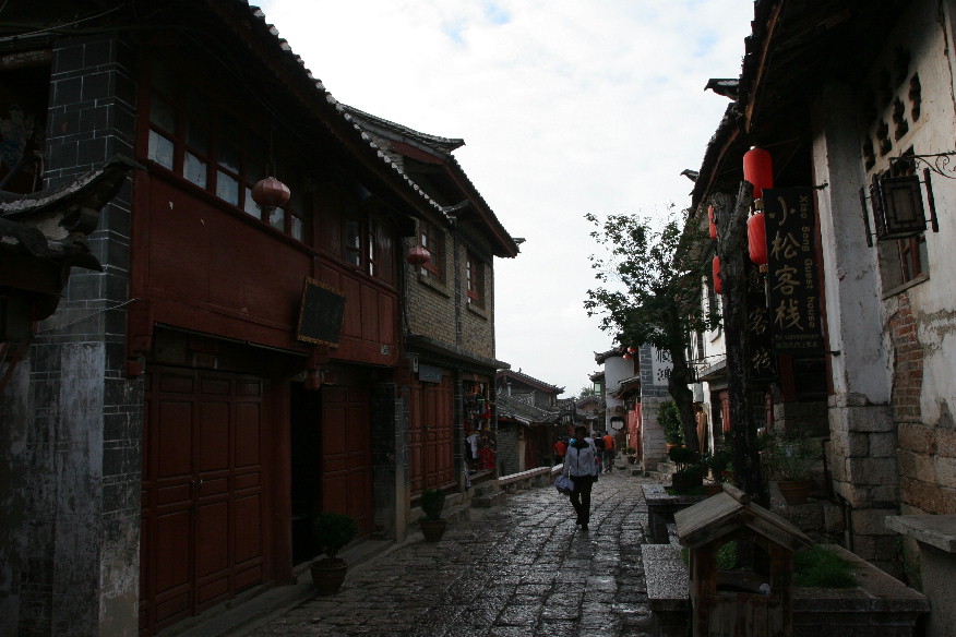 按照一些依稀的印象向拉市海的方向走,可走了不远,就找不到方向了,刚好看到有警察GG在路边,于是上前询问,警察GG是个大好人(hehe……),非常详尽地告诉了俺怎样怎样……走。在继续向前走了有十几分钟后,见到前面有一个红衣少年也在骑车向前飞奔,但是从穿着打扮来看不象是游客,更象是当地人,没有与他搭话,很快地超过他继续向前骑行,可没过一会儿,红衣少年竟然从后面赶上来又超过了我。就这样,一会儿我骑在前面,一会儿红衣少年骑在前面,当骑到一处岔路口时,我刚刚准备向那个大的路口骑去,红衣少年叫住了我,“你是去拉市海吗?从这边走要近很多!”就这样,两个人终于有了接触,开始边走边聊天(近路坡度太陡,无法骑车,只能推车前进,但路程要近许多)。通过聊天知道,红衣少年别看年纪小(也就十八、九岁的样子),却也在古城里有了一份自己的事业——卖旅游纪念品+出租自行车,对自行车的品牌、质量很有了解,告诉我“下次再租自行车时不要租这个,要租XXX牌的(忘记是什么牌子的了,只记得有GIANT)。”