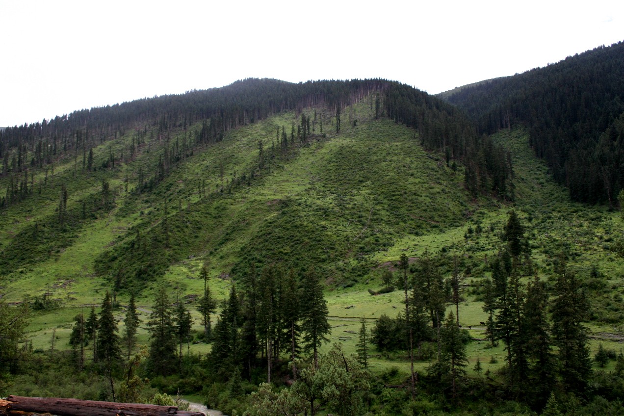 曾几何时, 在那疯狂的年代里, 有一个名不副实的与森林有关的单位, 美其名曰叫做森林工作什么的, 它的任务不是去保护森林, 反而是去人为的建造这样的祭场, 它先用飞机拍下所有的山沟, 然而派人进去计算可以砍伐的木材数量, 决定是否值得把路修进去, 把工棚修在山下, 它的所到之处,屠刀所向披靡, 森林惨遭屠杀, 民间人士痛骂它的三光政策, 森林砍光, 野兽杀光, 鱼类炸光, 三,四十年的浩劫下来, 高原上那连绵无边的森林, 被弄成了一片片光凸凸的荒山野岭。 现在这个单位虽然已经被取消了, 但它所带来的破坏, 还要延续起码一个世纪多, 被砍得稀疏的山林在猛烈的阳光下被晒得枝枯叶干, 地上的水分也无法保持, 因此经常引起巨大的山火, 被山火烧过的林子, 生态系统全部被破坏, 需要更长的时间恢复, 或者是永远没有办法恢复, 从事林业工作保护工作的人告诉我们, 在三四千米的高原上, 很多小树根本没有办法人为地去栽培, 过去的森林都是自然形成的, 它们一旦被砍伐, 就再也没有办法长出来。