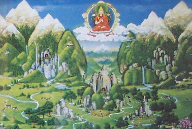 藏族著名画家安多强巴所绘制的唐卡,表现了香巴拉一样的幻境:山好,水好,草好